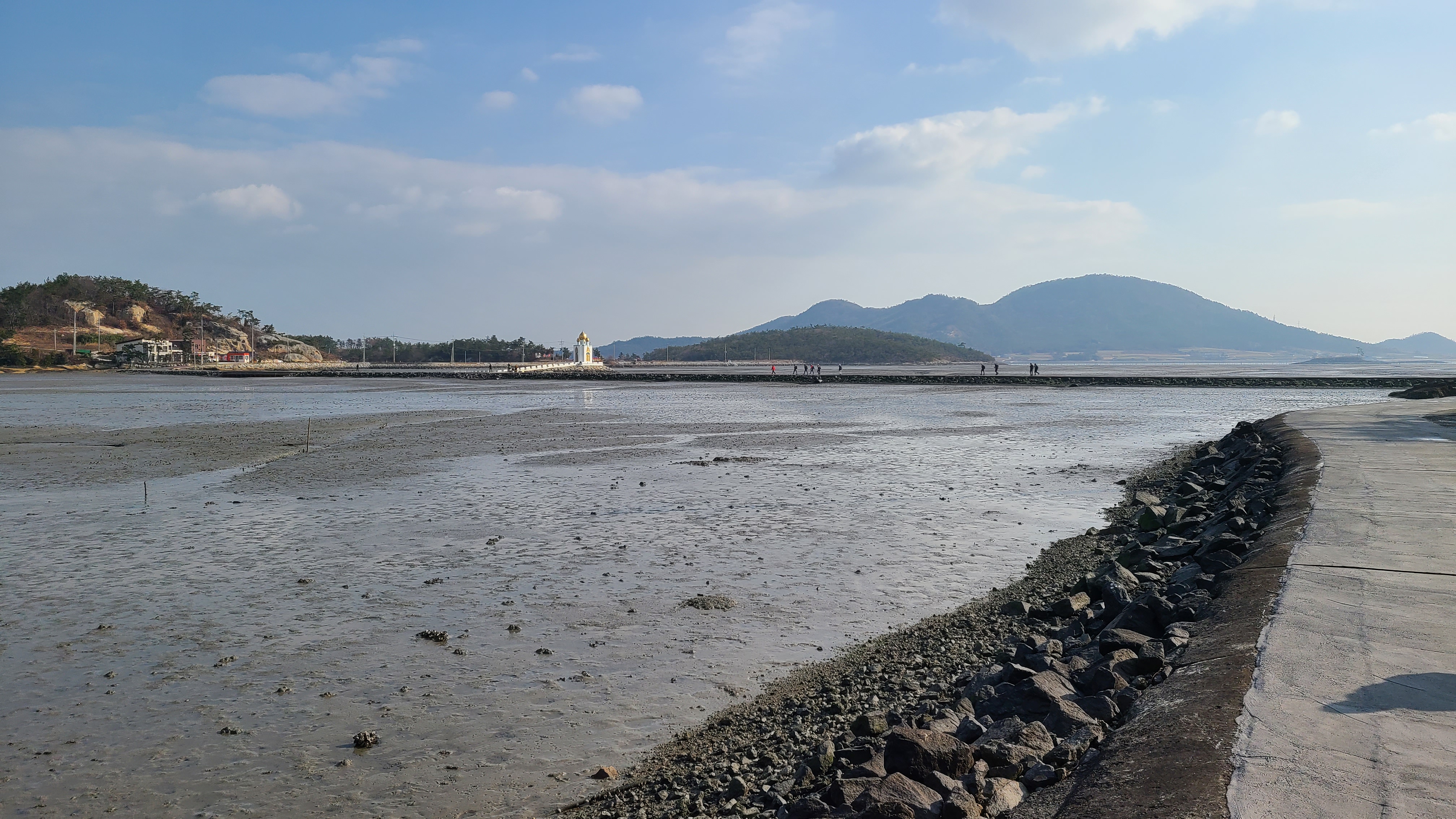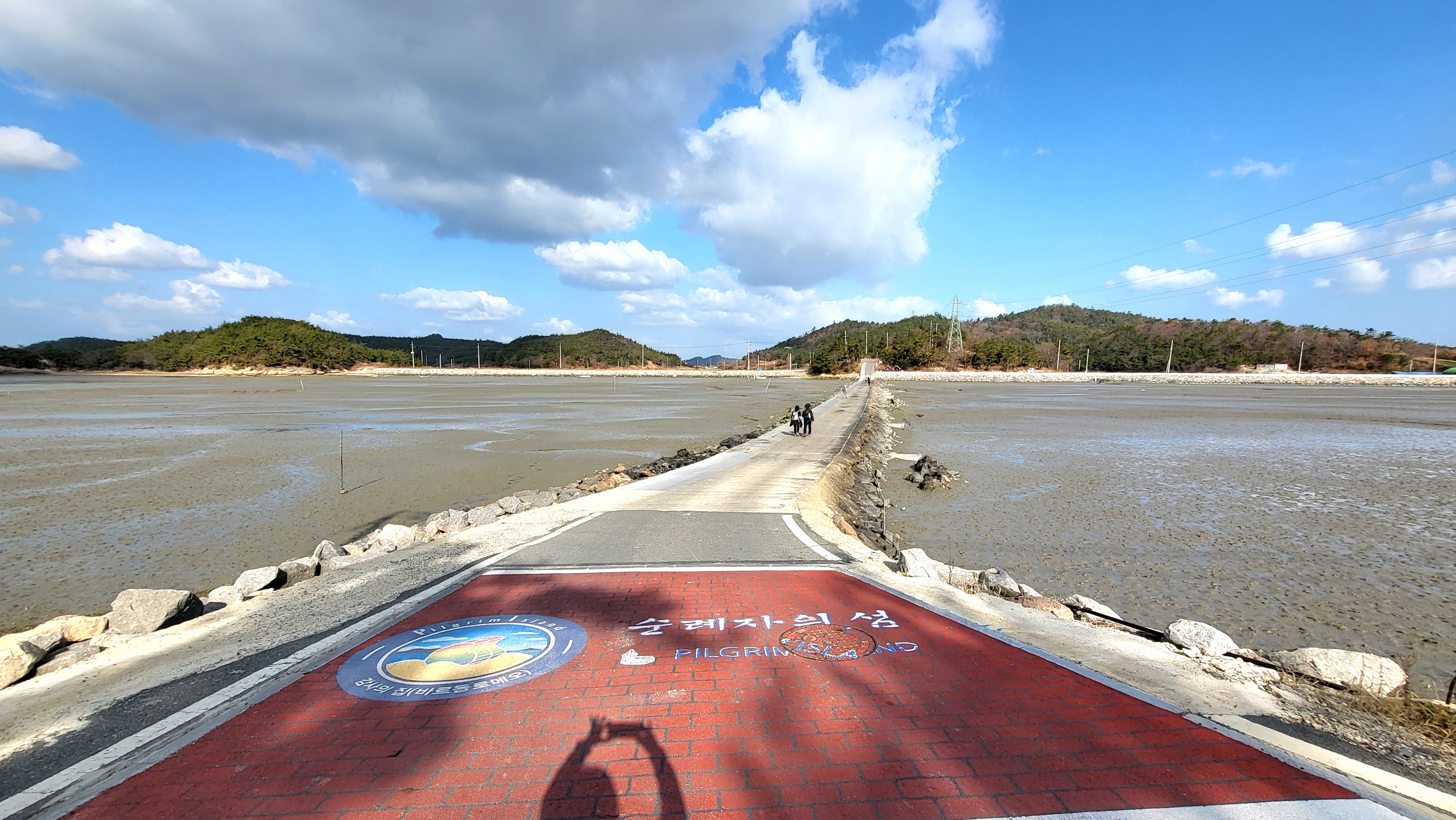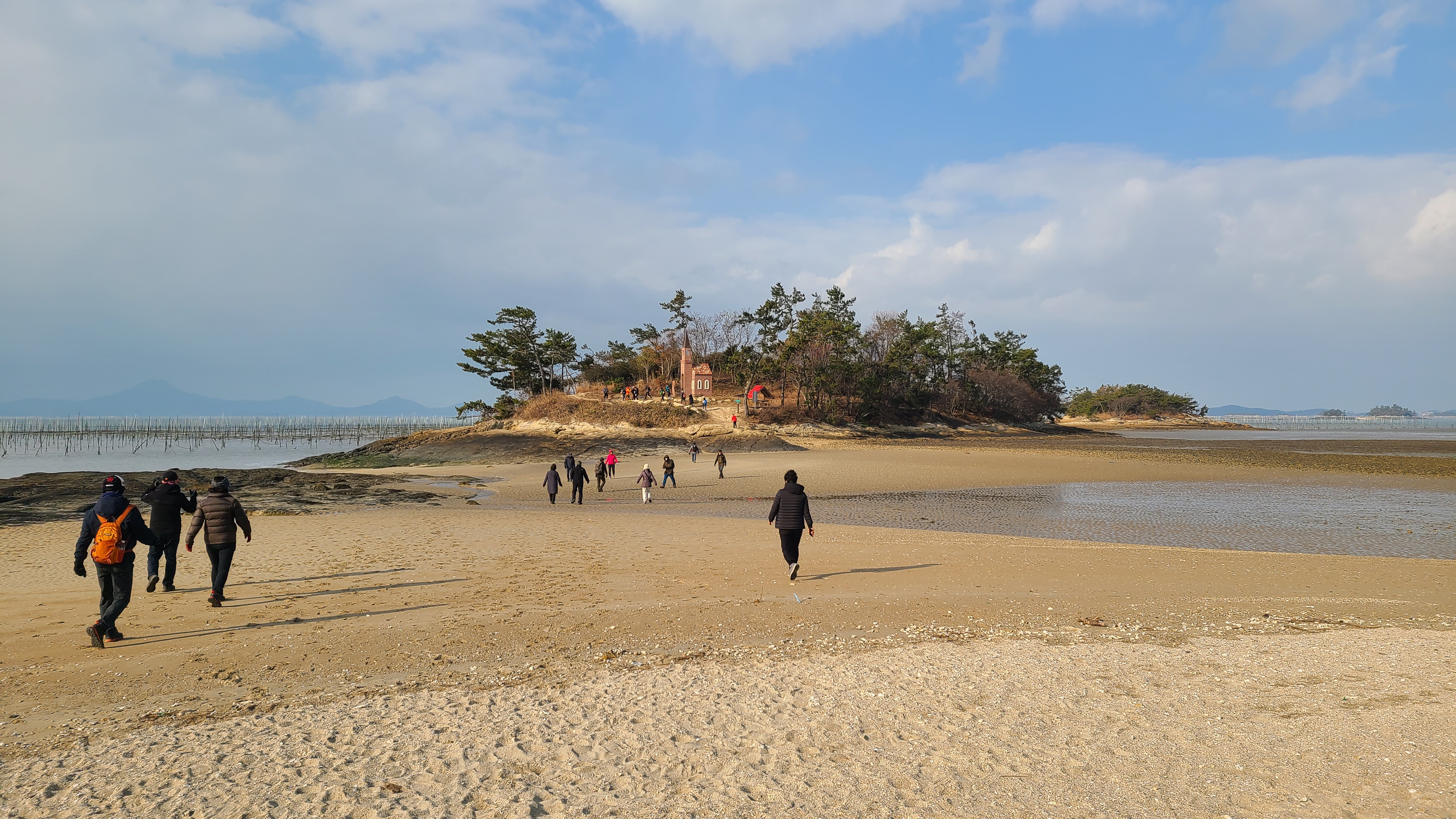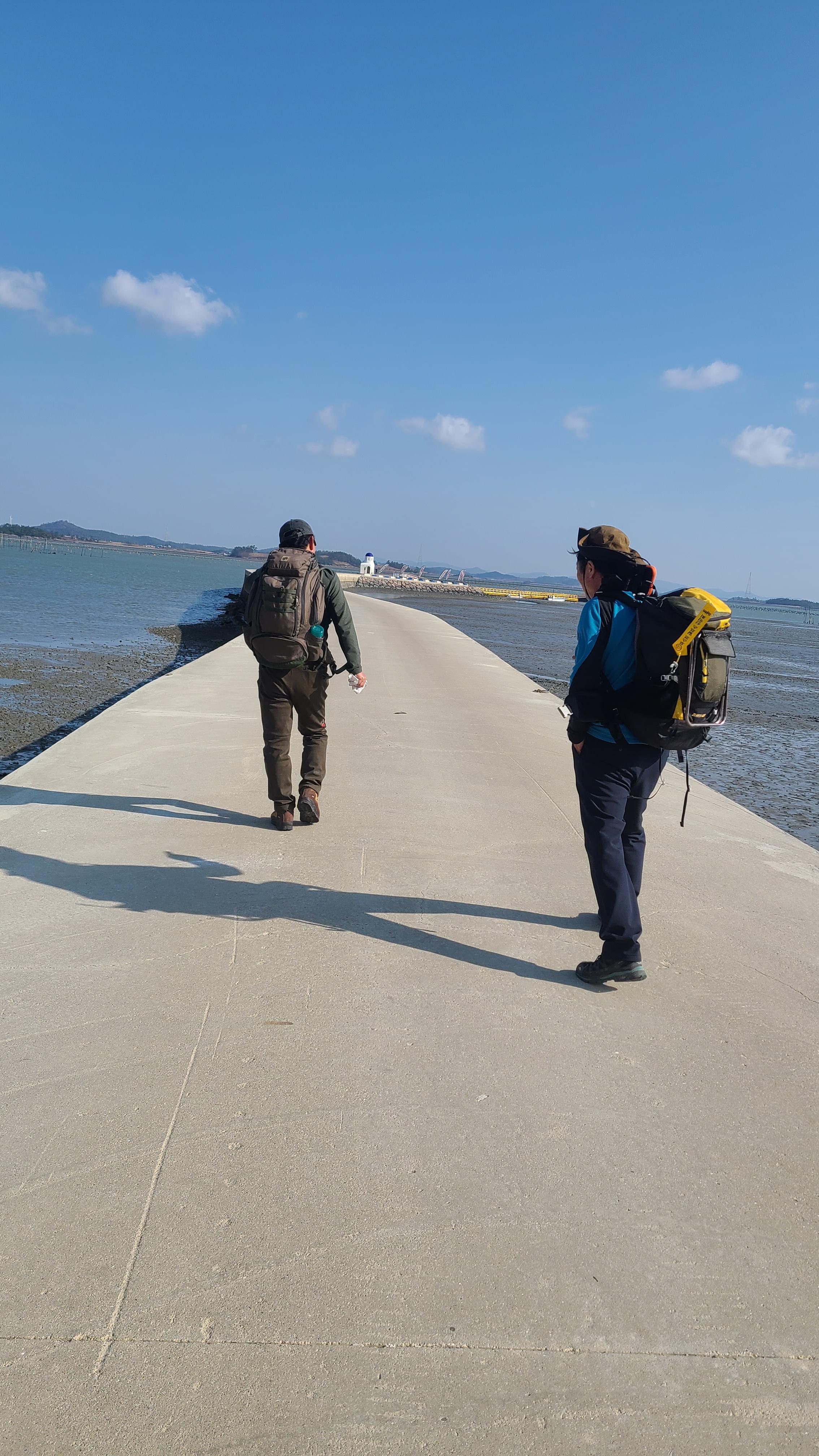 썰물로 물이 빠진 딴섬을 건너 간다.