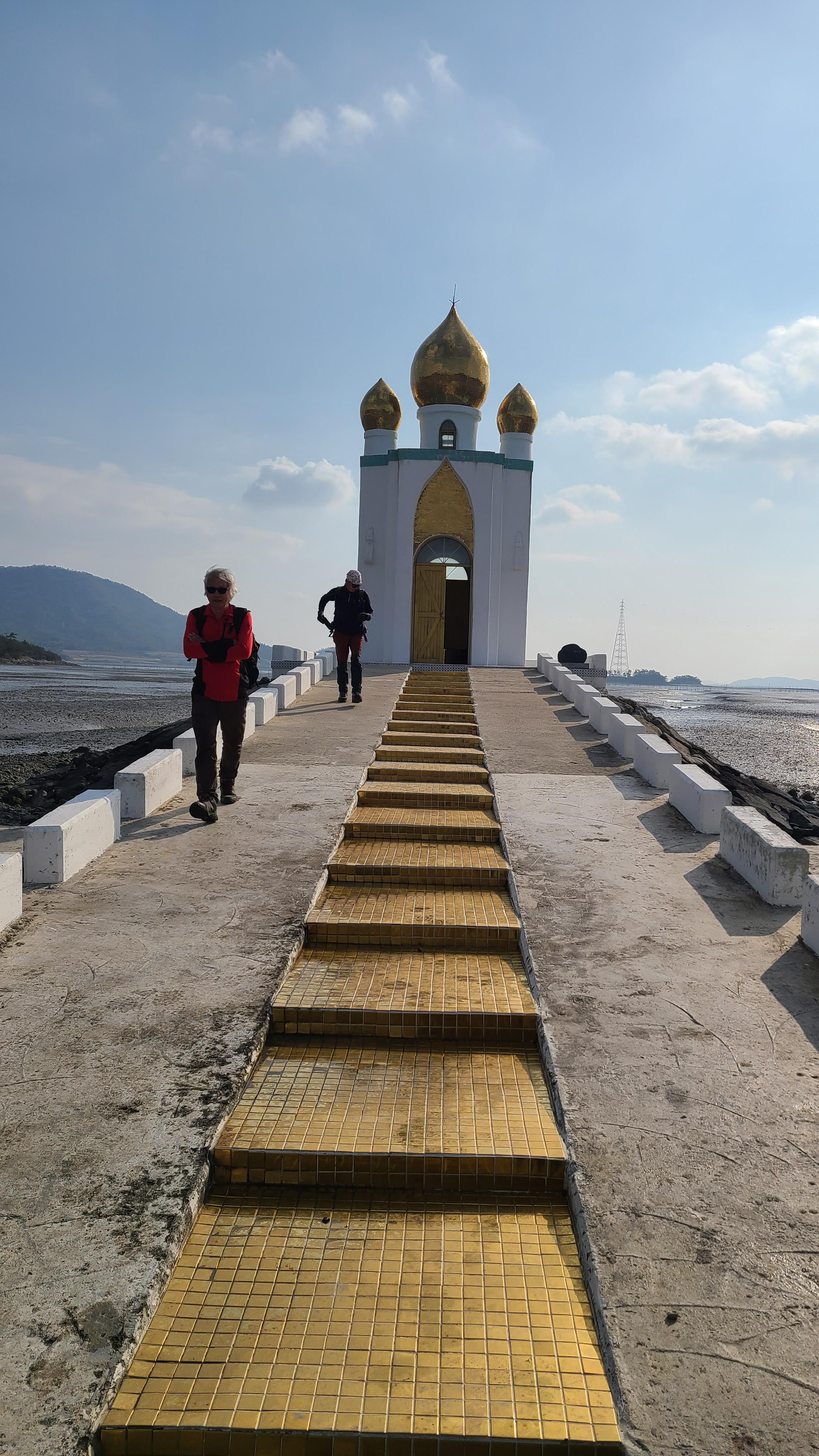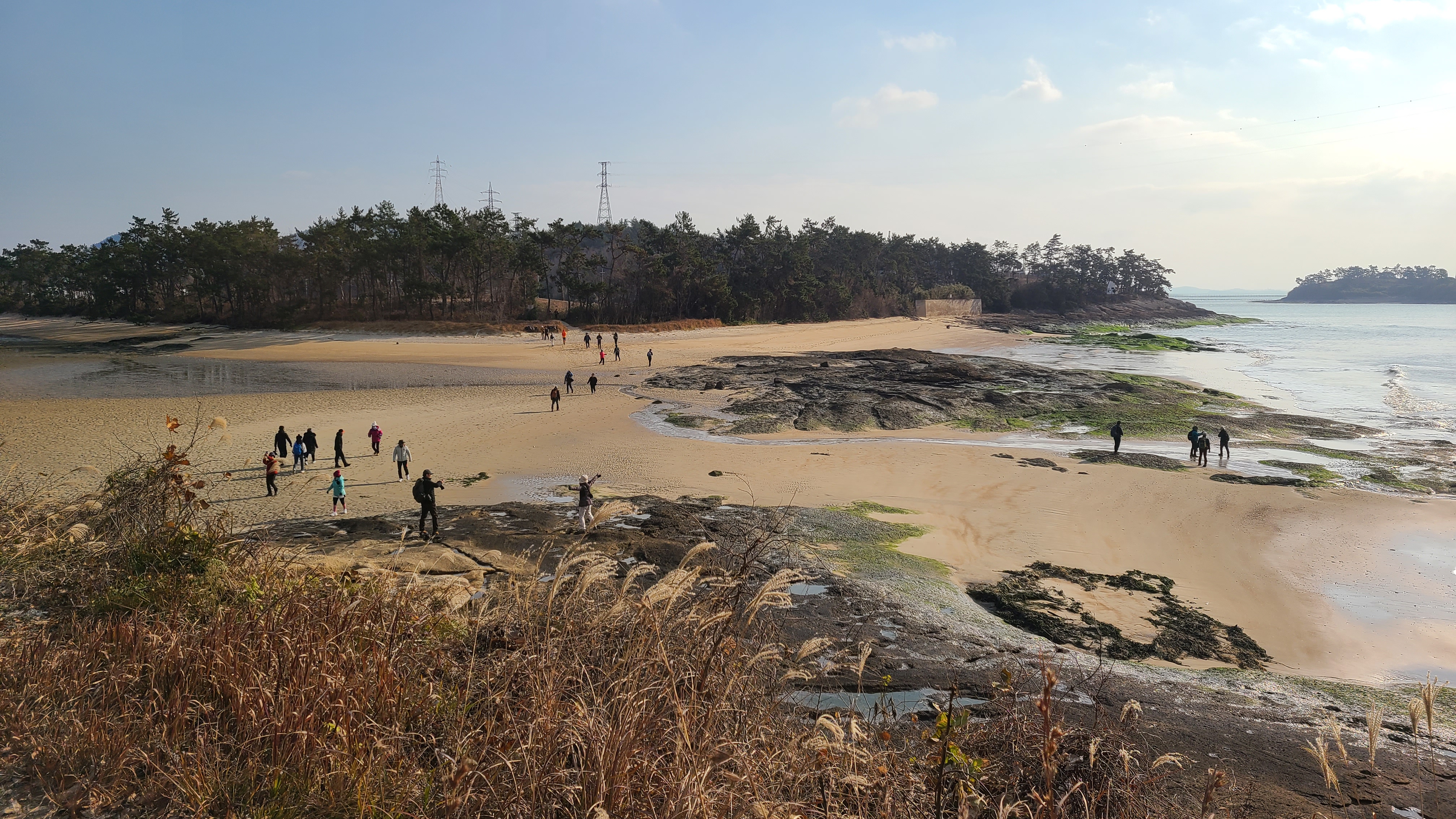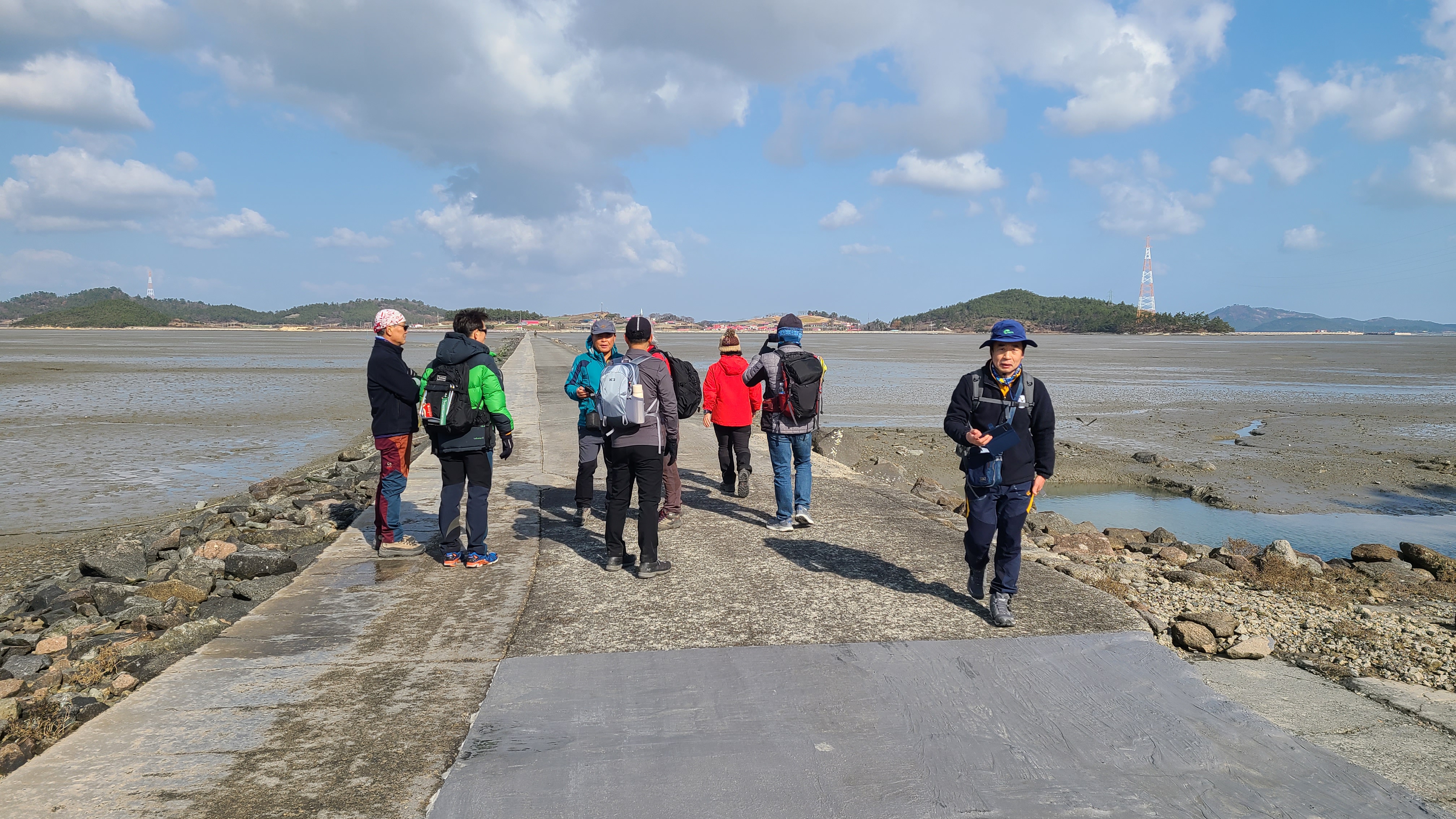 썰물로 물이 빠진 딴섬을 건너 간다.
