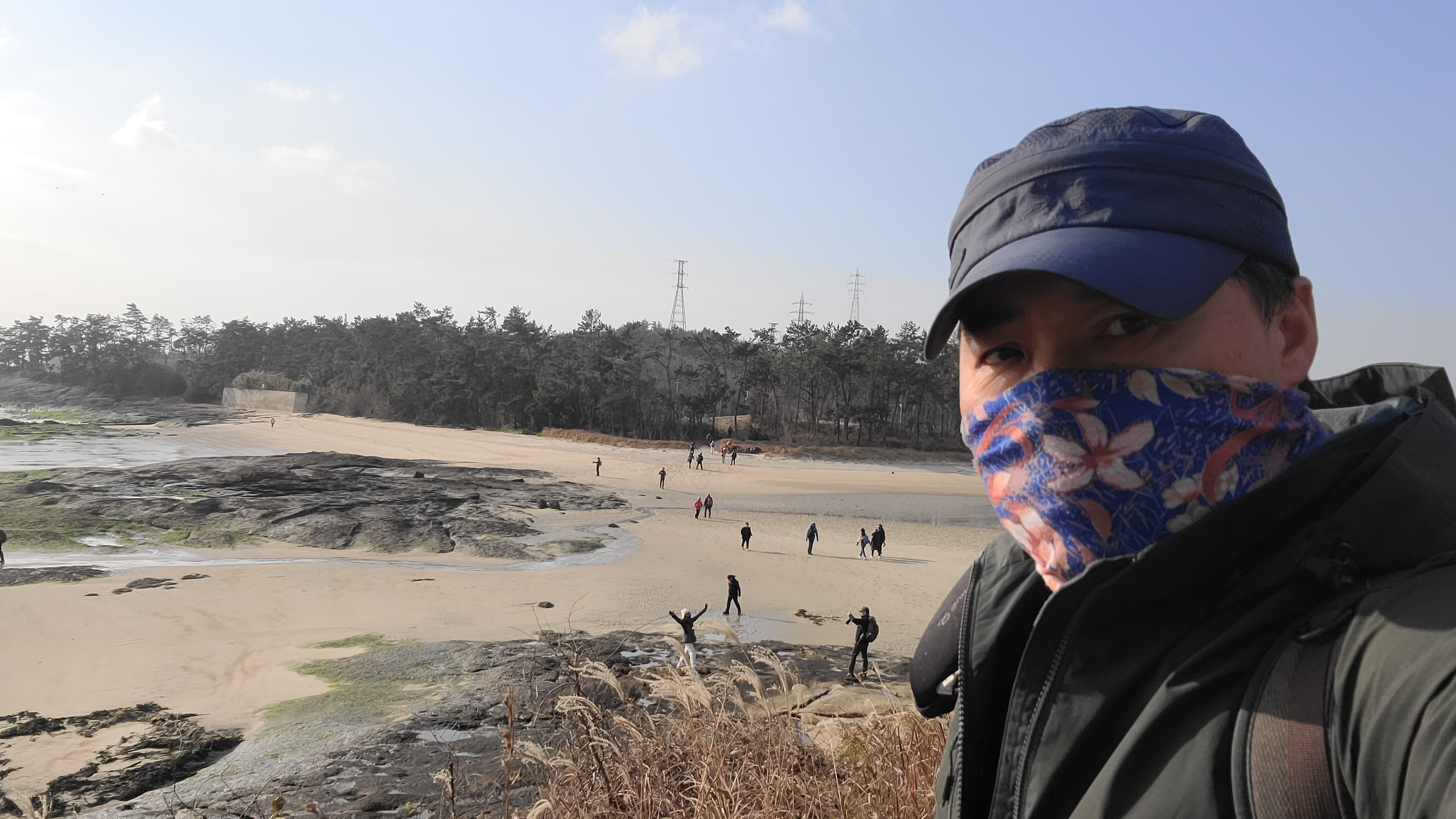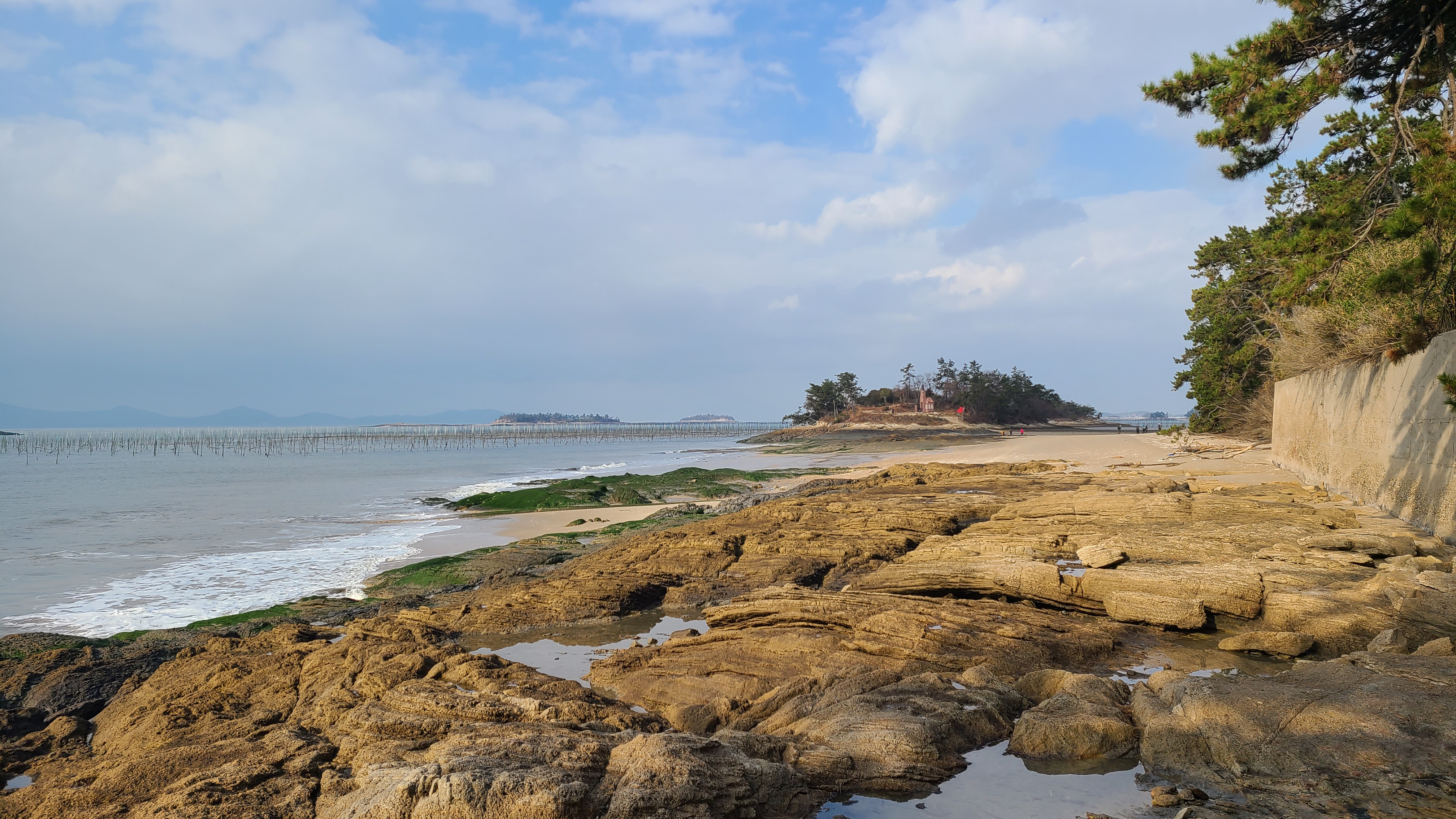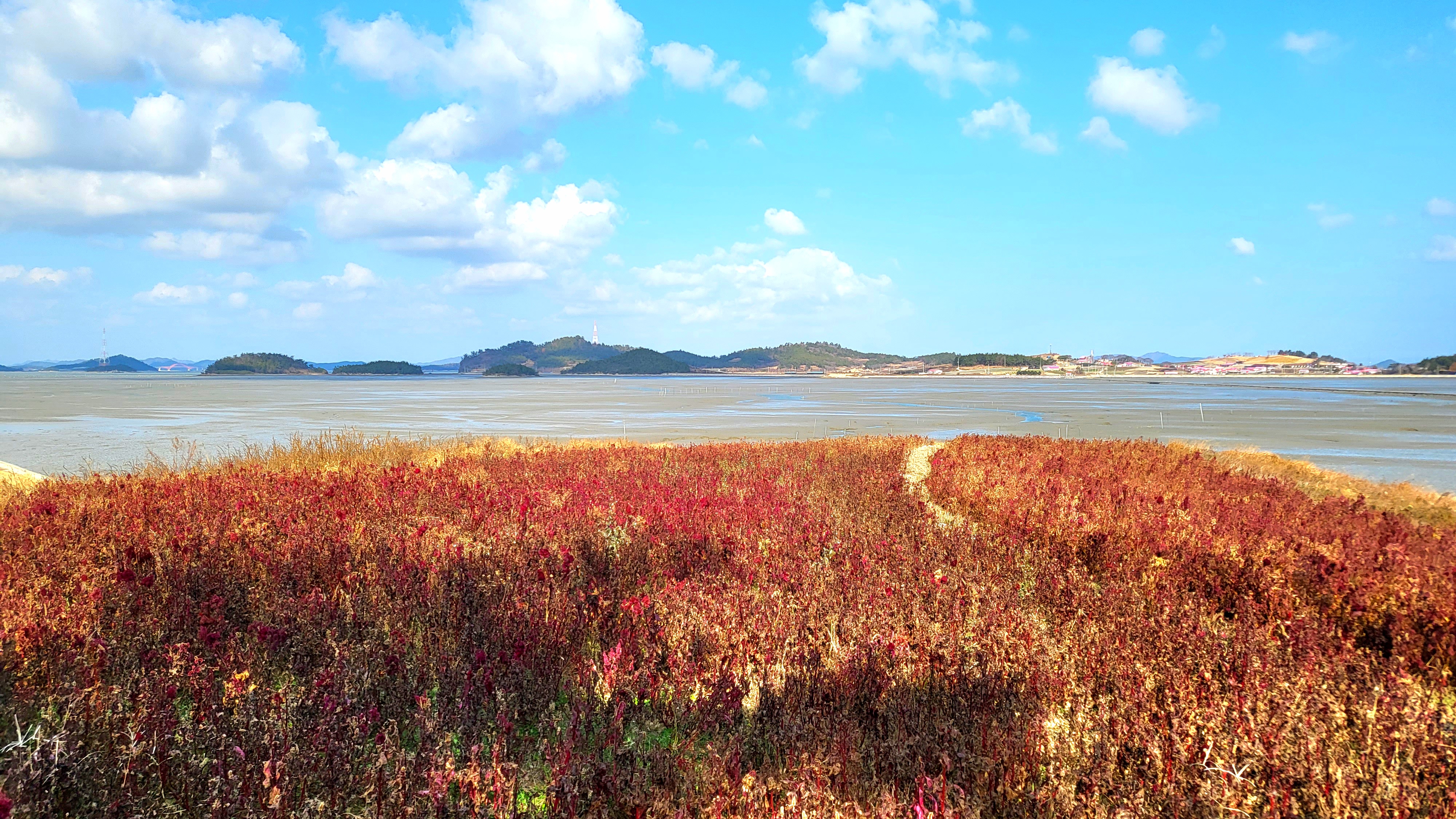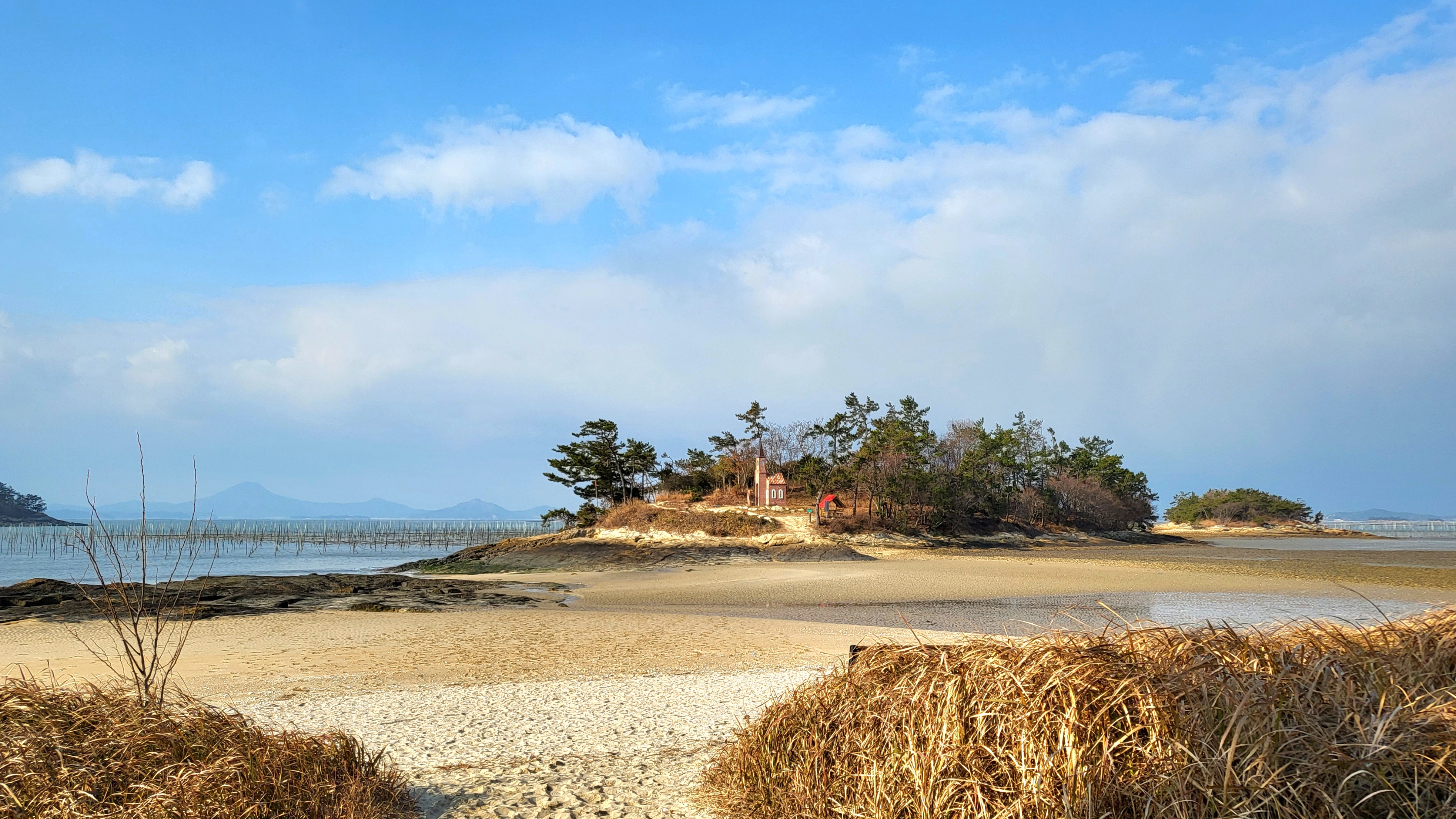 썰물로 물이 빠진 딴섬을 건너 간다.