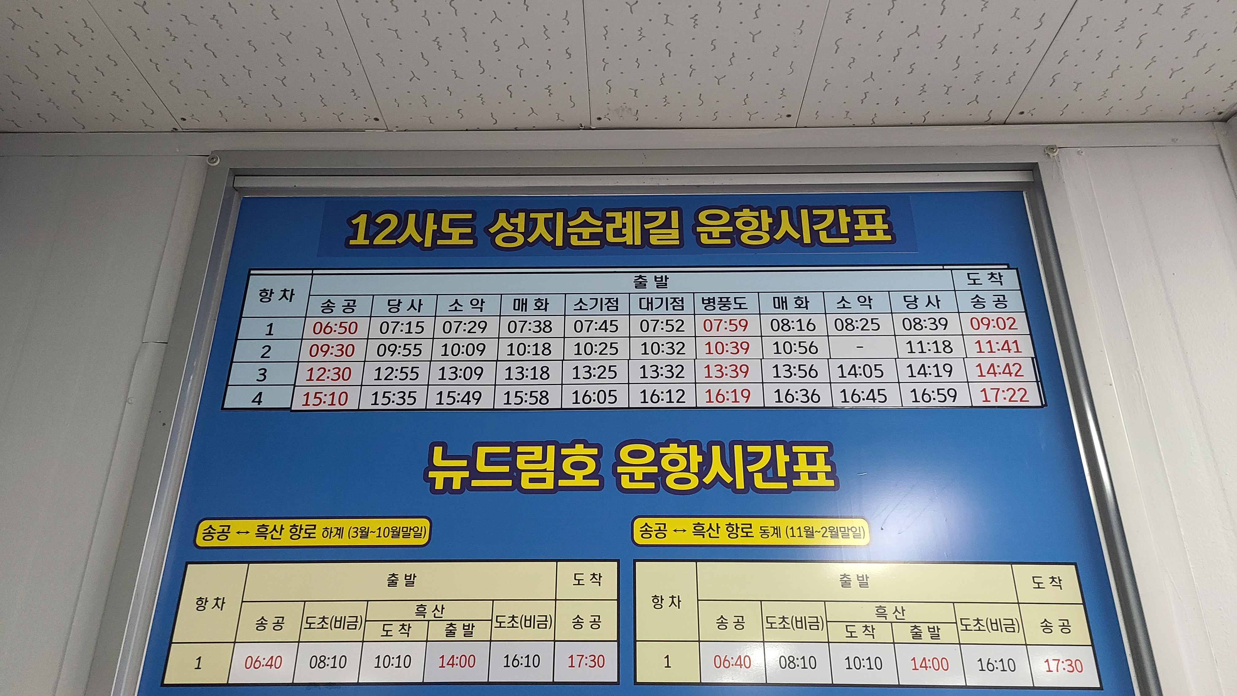 이유는 풍랑주의보가 내려서 마지막 배가 뜨지 않기때문이란다.