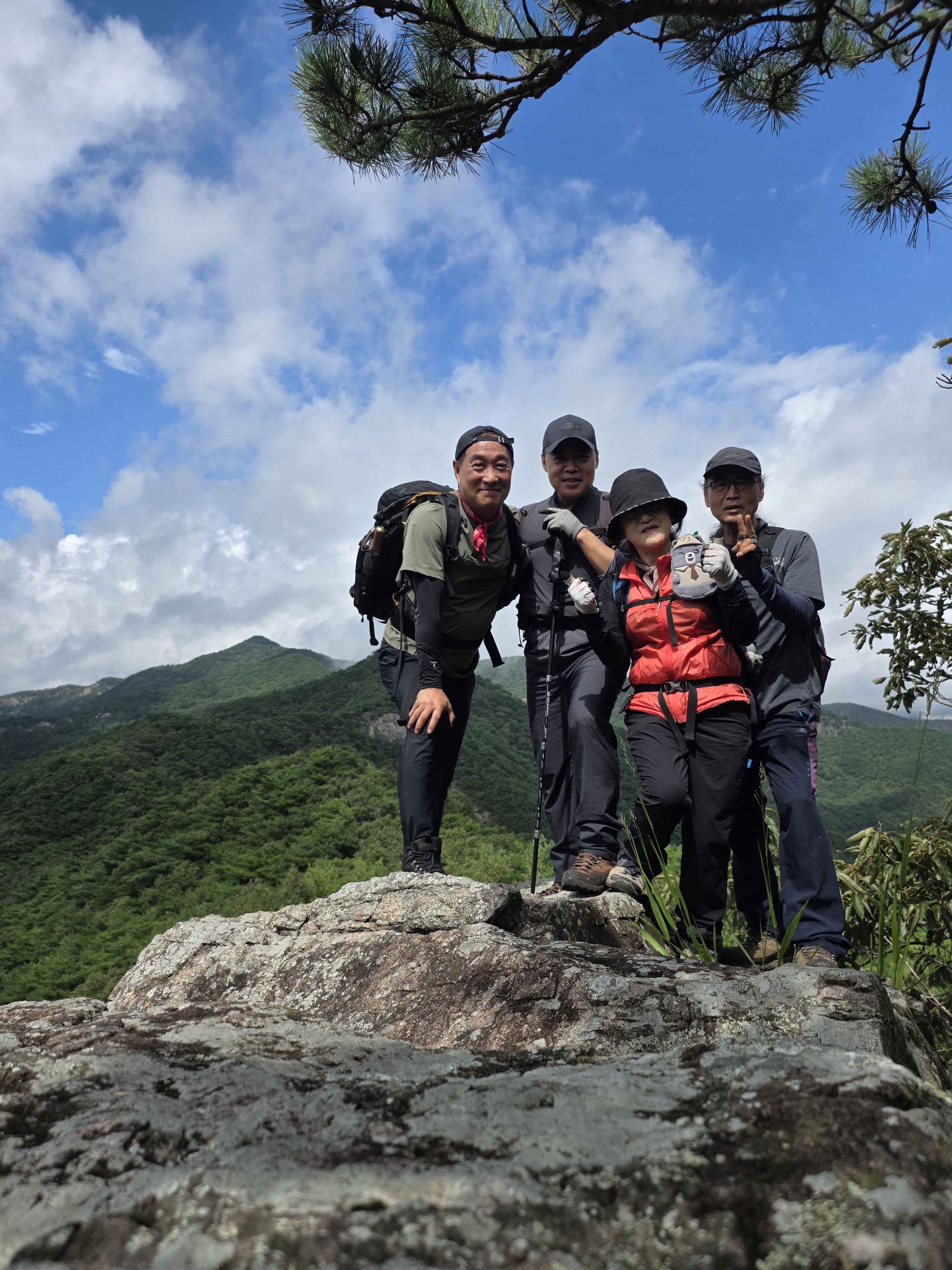 조망바위에서 돌에 폰을 올려 놓고 어렵게 단체 사진도 한 컷 찍었다.